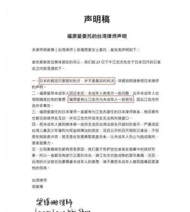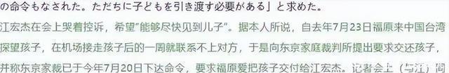 2020年,东京家庭法院判定长子抚养权归江宏杰。 然而,福原爱不仅拒不执行判决,还借探访之名,私自将儿子从台湾带回日本。